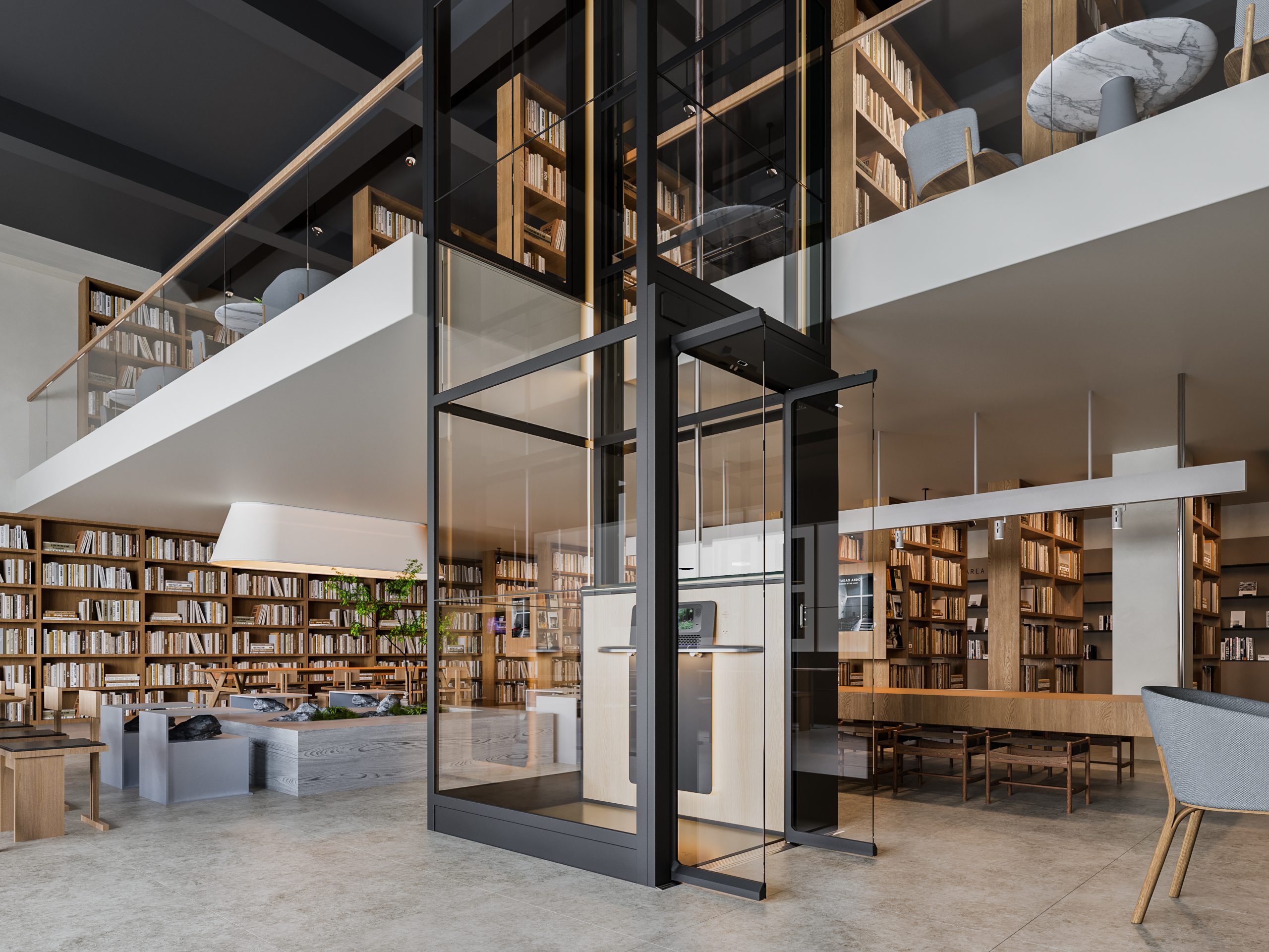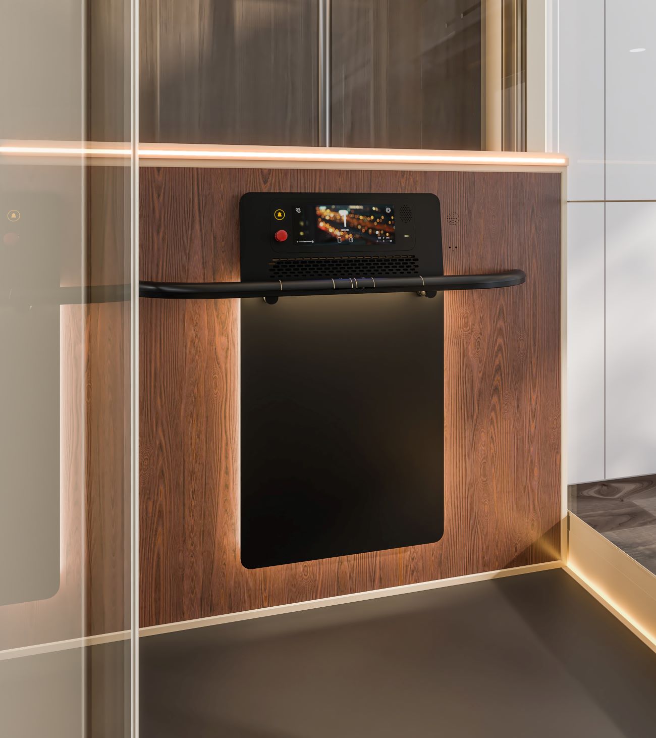› Refined lighting concept: Recessed ceiling, guiderail, and platform edge lighting create a bright, elegant, and visually guided lift experience.