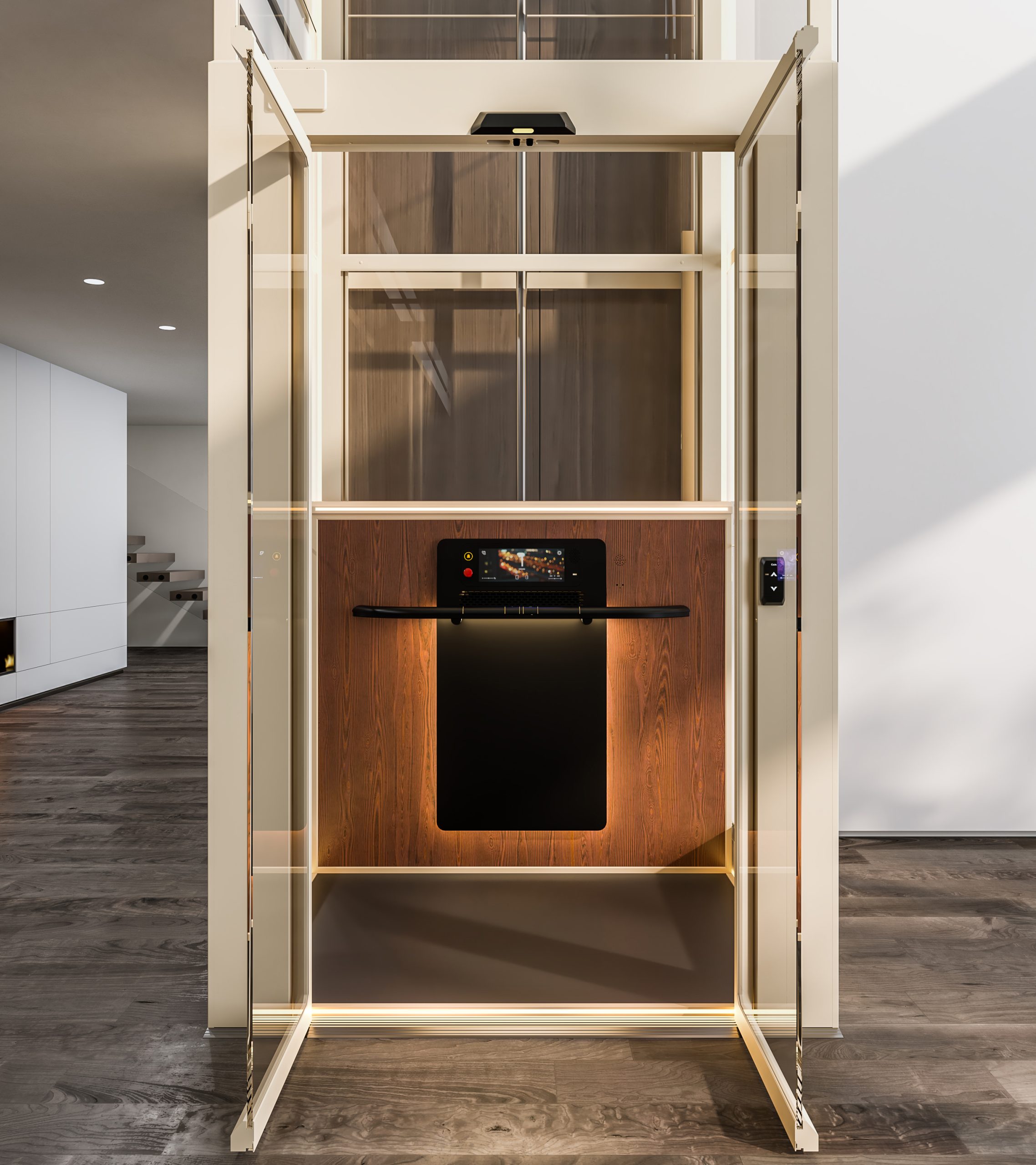 › Natural Oak interior finish: Real wood-inspired oak panels bring warmth and a premium, residential character – setting it apart from conventional metal-based lift interiors.